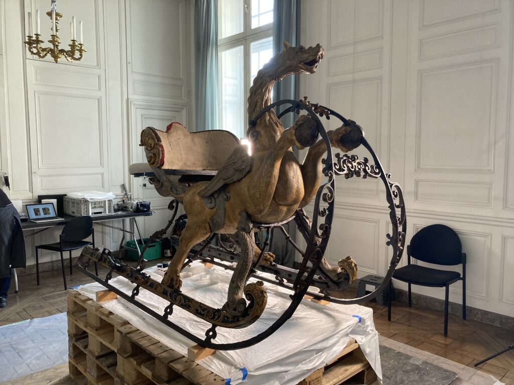 From October 2023, for 9 uninterrupted months, different successive trades began to work on the restoration of a very old and rare ceremonial object, the so-called flying dragon sleigh, probably made for the Grand Dauphin, son of Louis XIV, at the beginning of the 18th century.